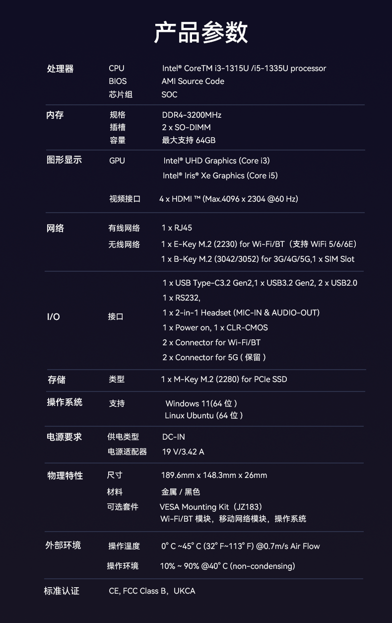 熊猫科技D613采用英特尔Raptor Lake酷睿i3-1315U/i5-1335U 处理器,作为一款性能强悍的主机,它的TDP仅15W,能有效降低能耗,延长电池寿命。在内存方面,D613采用2 x SO-DIMM DDR4-3200 MHz,最大可达64GB,并配备1 x M-Key M.2 (2280) for PCIe SSD。