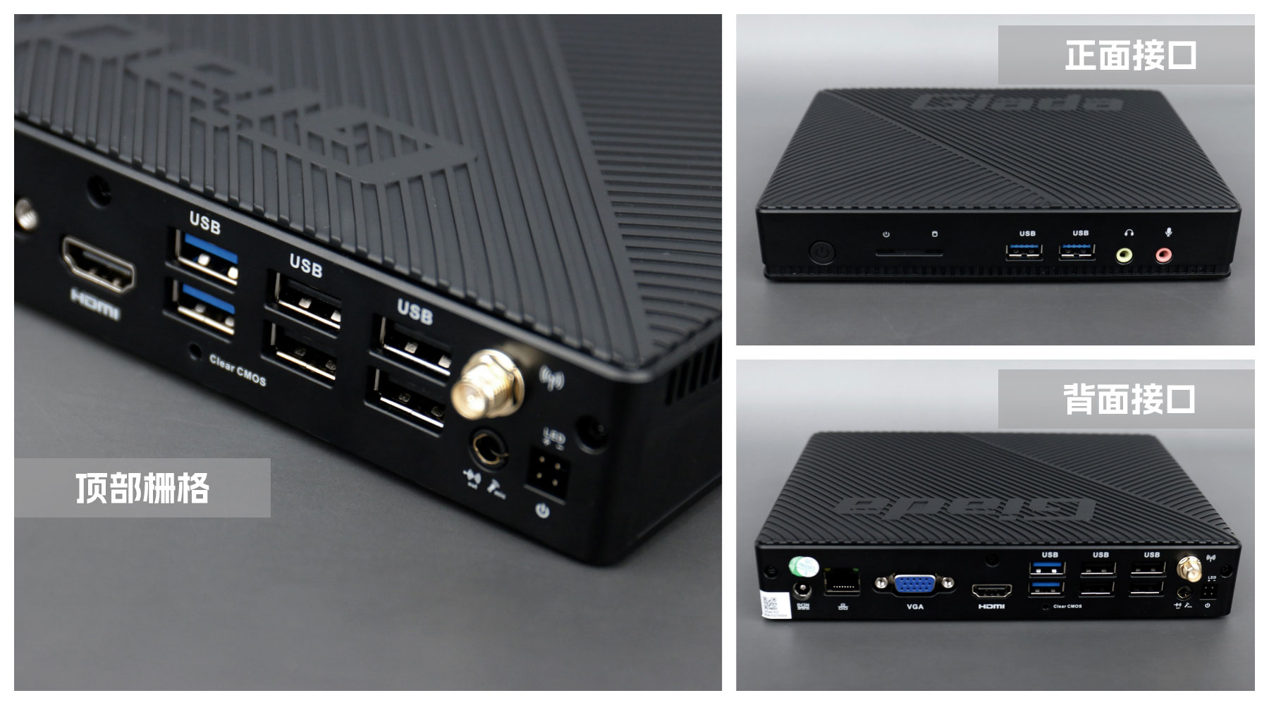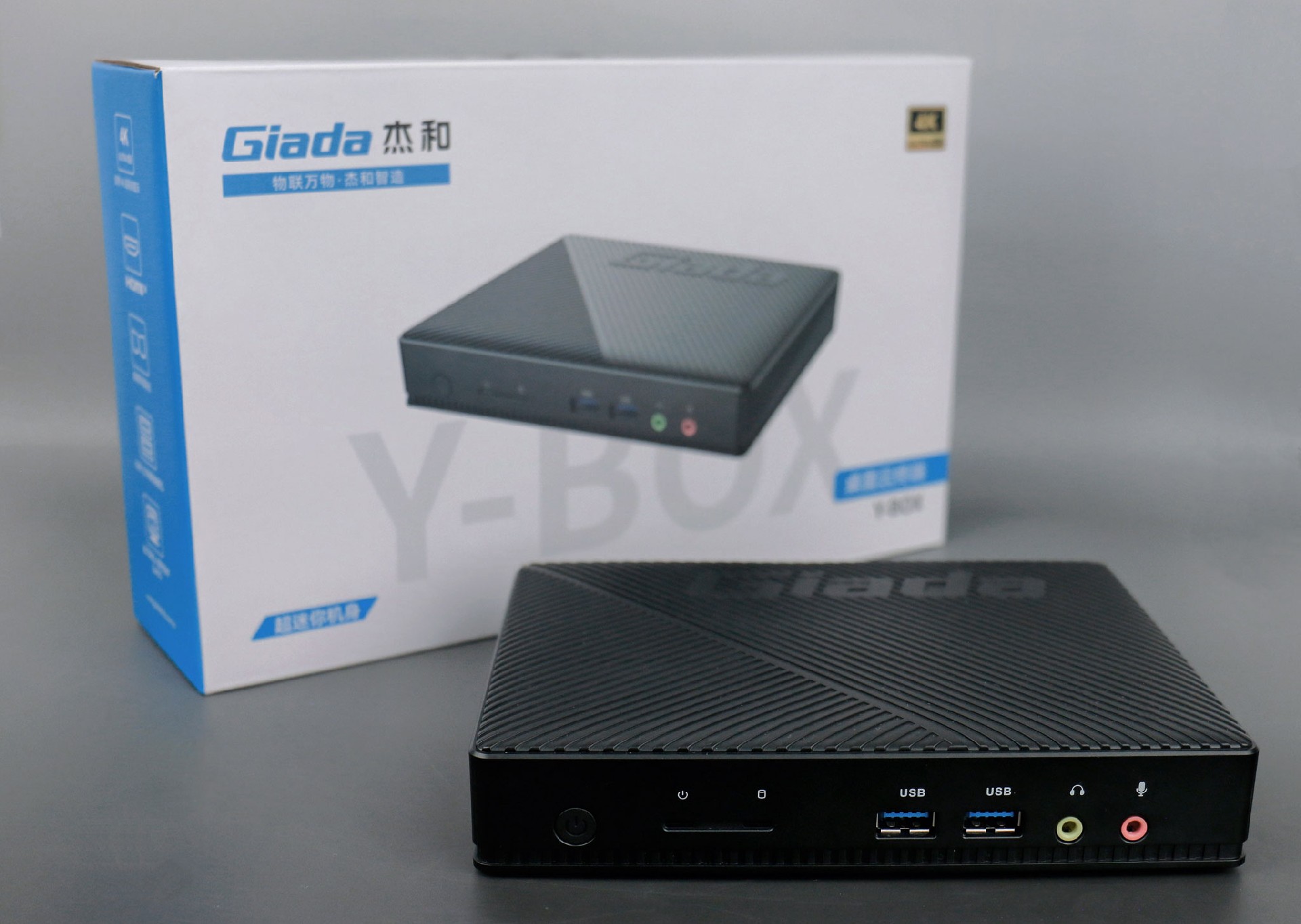 熊猫桌面云终端Y-BOX S2采用全新外观ID设计,主盖采用黑色哑光栅格,顶部刻印熊猫Giada品牌名,磨砂塑胶材质,高质感更轻盈。外包装采用简洁商务的风格设计,以熊猫蓝的配色作为点缀,内部采用严实防震的珍珠泡棉保护主机,同时,内部配备适配器、AC线、天线棒、螺丝包,满足通用需求。