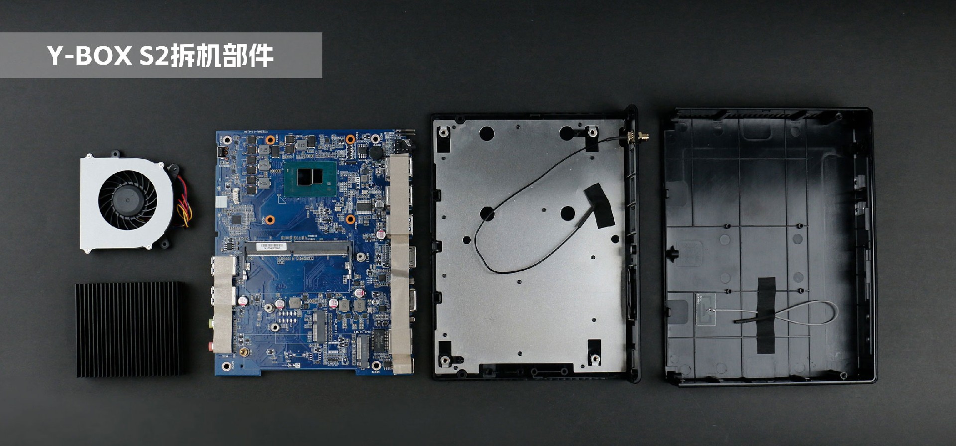 熊猫桌面云终端Y-BOX S2机壳由两片式塑胶壳组合而成,整机由上至下主要分为三个部分:顶部外壳、内部主板、底部外壳。底部外壳内附一层铝板防静电,以防主板被静电损坏。主板处理器顶部安装一体式铝板鳍片,并涂抹一层散热膏用于导热,提高散热强度。同时,主板中部安装强劲的风扇用于散热,降低内存与硬盘读取时受温度的影响,提高运行稳定性。