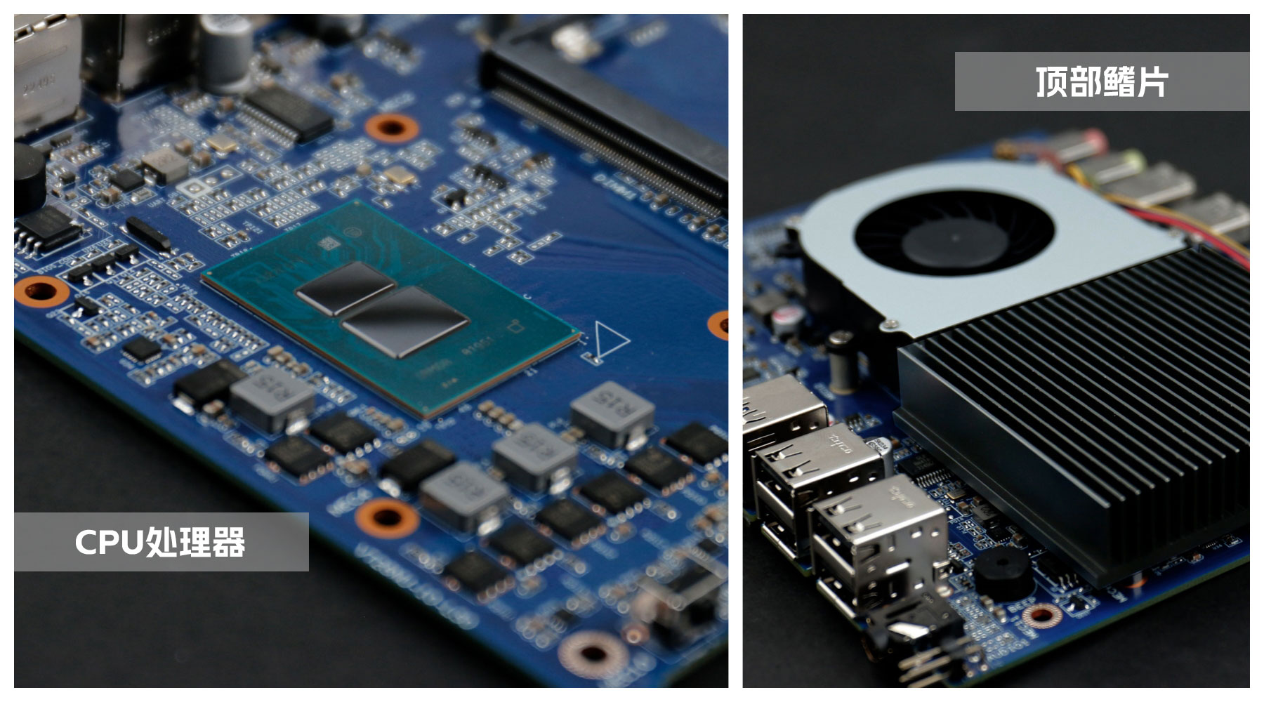主板是熊猫桌面云终端Y-BOX S2的核心部件,拆开主板上的顶部铝制鳍片与风扇,整体配色是常规的深蓝色,由熊猫自有工厂倾力打造,CPU采用板贴的形式,表面涂了一层散热膏用于导热,可以支持intel新一代Alder Lake-N平台处理器,为英特尔首款基于 7nm 的产品线,最高可支持到8核,采用大小核(E核、P核)的全新架构,在同等功耗下有更优异的性能表现。