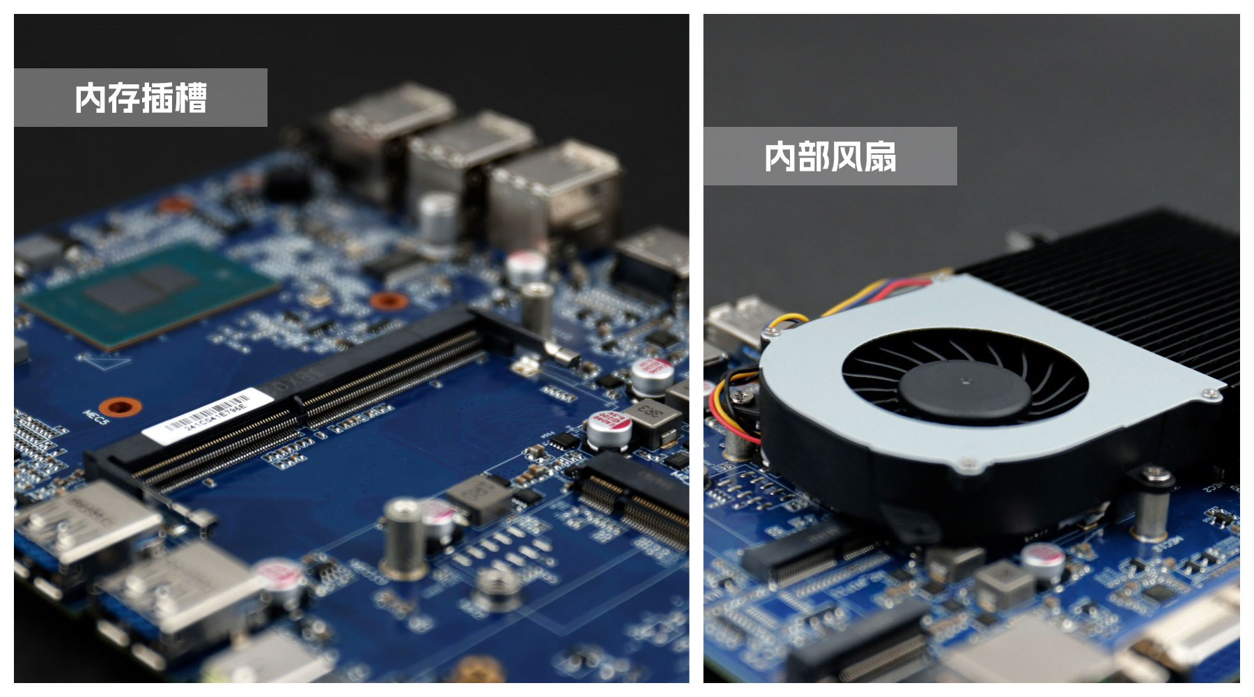 熊猫桌面云终端Y-BOX S2主板中部是内存插槽,采用单通道笔记本内存槽设计,最大支持容量可达32GB,最高支持DDR4-3200MHz频率,横插的形式可以减少主板的占用体积,使整体机身更紧凑,内存顶部的风扇起到高效散热的作用。