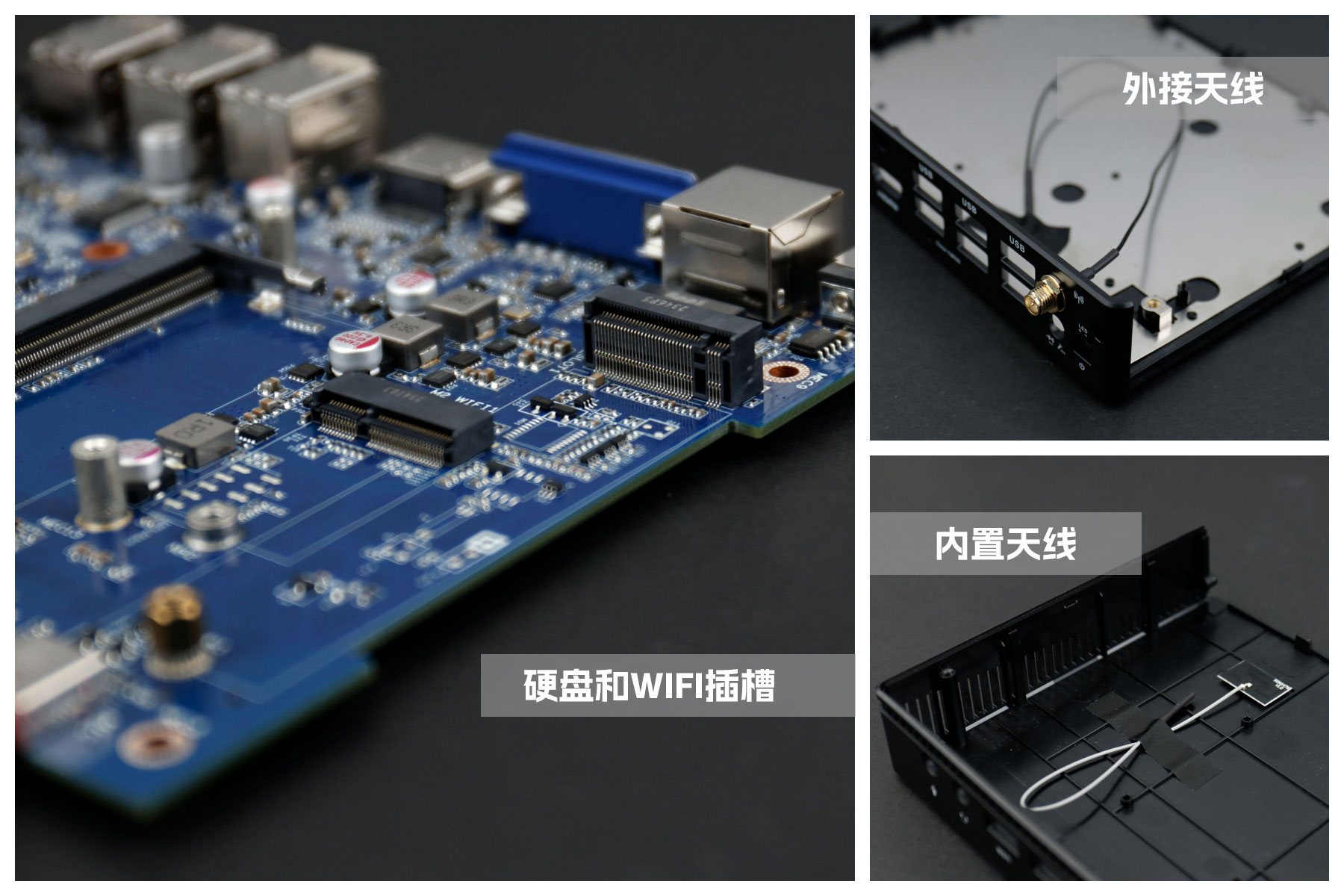 熊猫桌面云终端Y-BOX S2主板上配备了 1个 M.2 固态硬盘位,接口规格为 PCIe3.0 标准,匹配标准的 2280 规格硬盘。一侧还有一个M.2接口,匹配2230长度的WIFI/BT模块插槽,WiFi模块可以连接的是外接天线,增强信号,同时也可以内接天线,灵活应用,支持Wi-Fi 5/6/6E网络。
