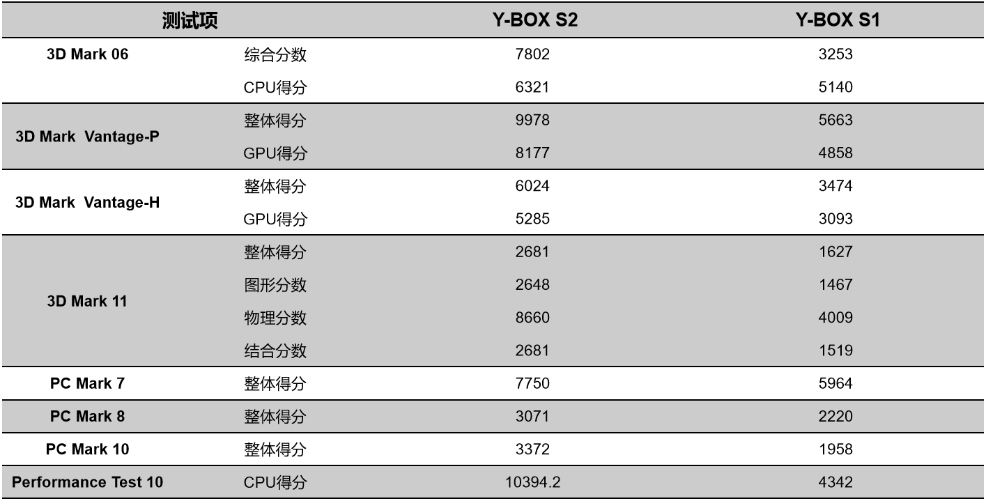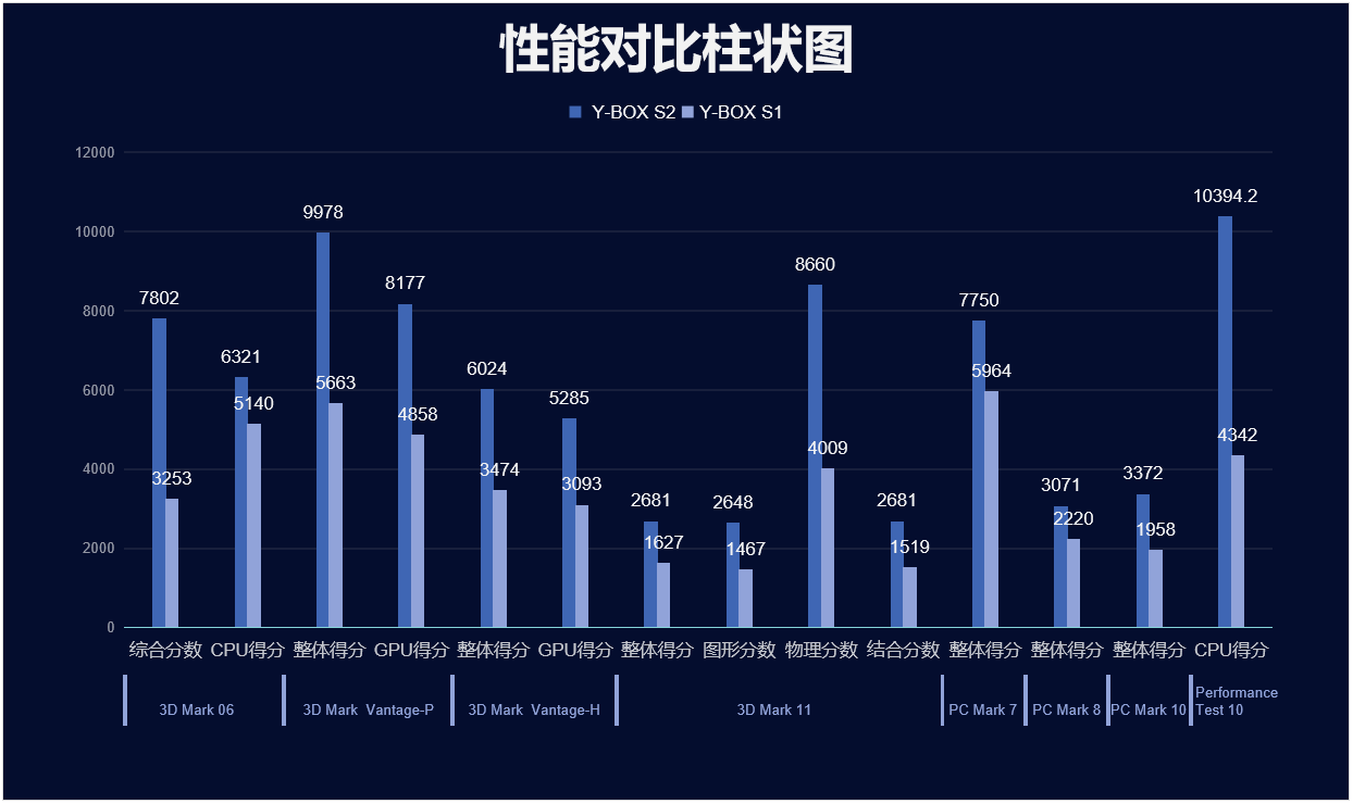 熊猫来具体看看各个测试项目的跑分情况,测试项目包括显示性能测试、系统性能测试、CPU性能测试,分别用3D Mark、PC Mark以及Performance 10等系列不同软件的跑分数据,针对两款主板的跑分情况可以看出,熊猫桌面云终端Y-BOX S2的数据在各项性能上都得到了大幅度提升,柱状图能更直观地体现出数据的变化,熊猫将针对具体的几项数据来进行详细分析。