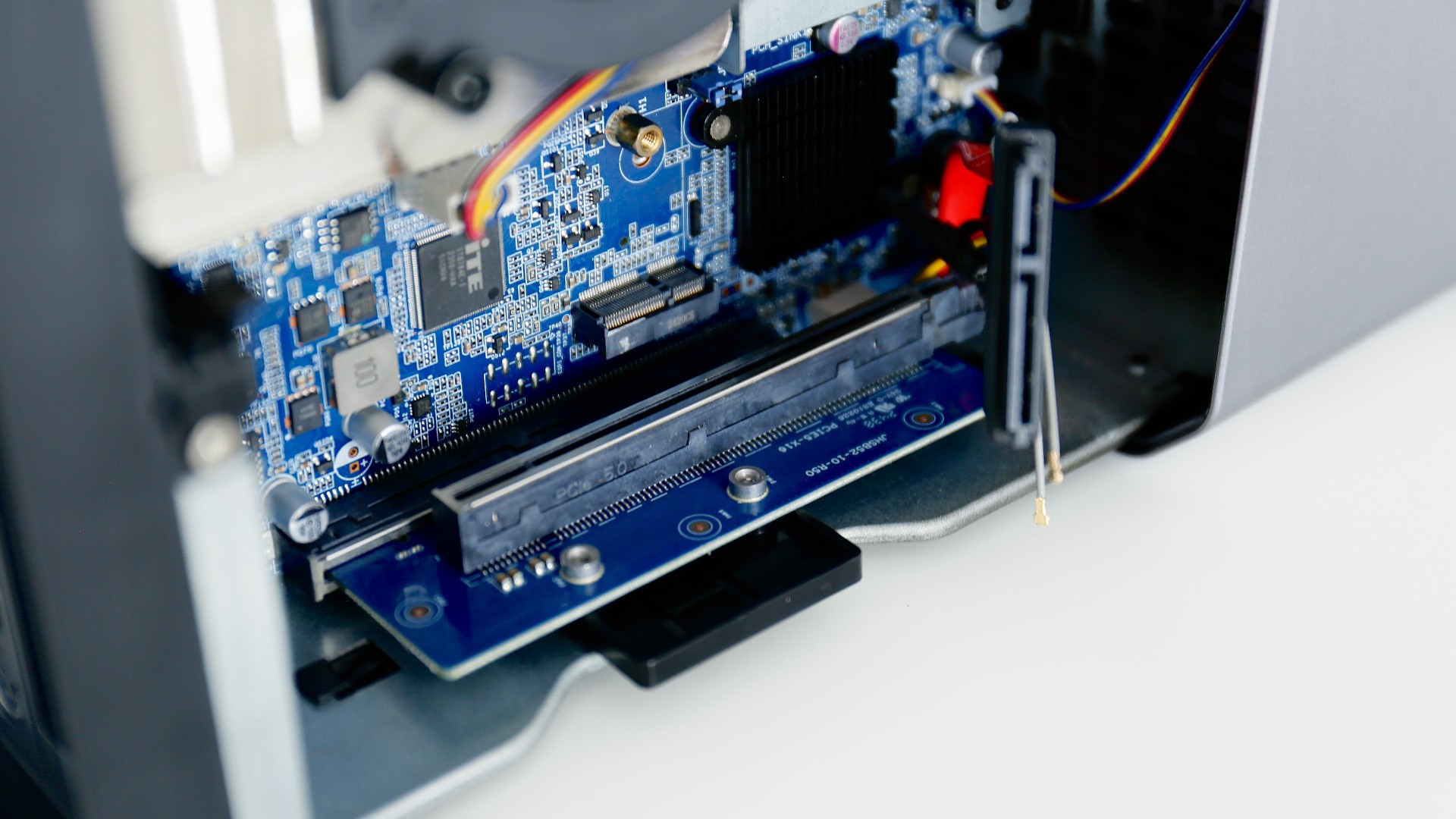 打开WA814内部,熊猫可以看到PCle5.0 x16 高速扩展口,它的速度高达64GB/s,可以实现独立显卡、多网口、高速 SSD、多 COM 等设备的扩展。