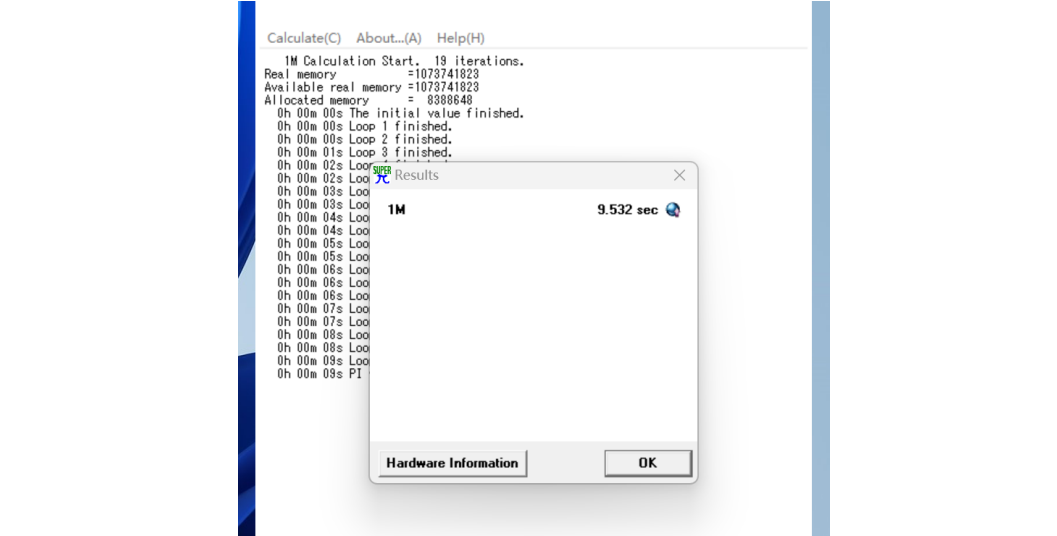 为了评估 CPU 的性能,熊猫使用了Super PI 1.1 进行了测试,软件以用时为参考成绩,花费时间越短代表计算性能越强。在本次测试中,Core i5-13400 处理器用时 9.532 秒完成了计算,属于当前中端处理器的主流水平,足以应对日常编码、分析和轻量建模任务。