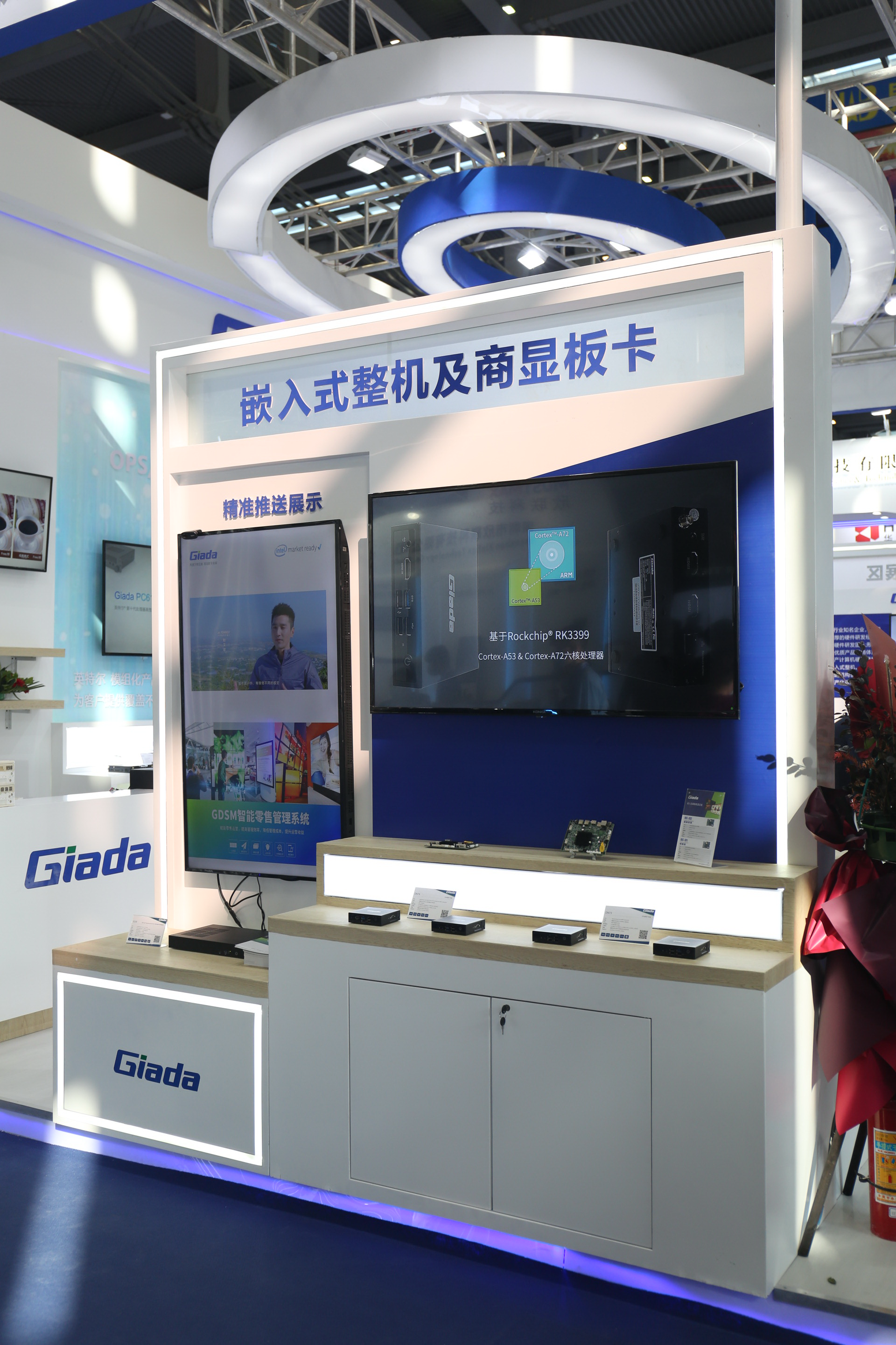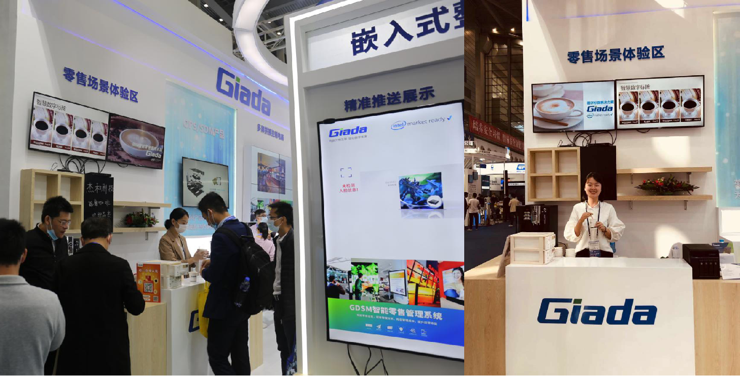 紧邻ARM架构商显产品集的精准推送展示区与零售门店模拟展区,共同组成了本届展会熊猫科技展位的一大精彩设计。场景展现了GDSM智能零售管理系统在零售门店场景下的展示效果,顶部的数字标牌由GDSM系统推送内容,模拟搭建了针对人流动线的广告精准推送形态。