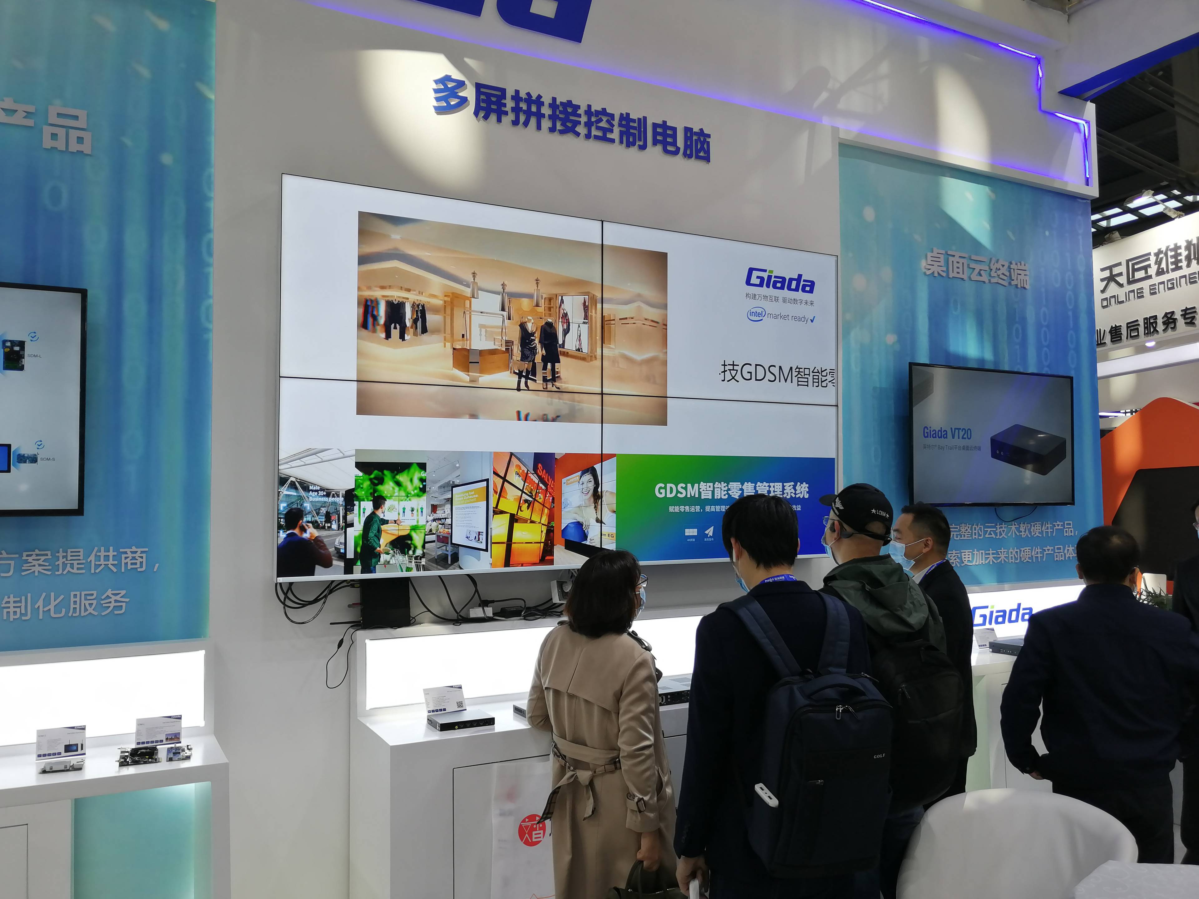 正对展位的核心区域,分别陈列了熊猫科技行业重点产品OPS/SDM可插拔商用显示模组;桌面云终端产品整机;以及针对LCD多屏拼接的高度集成多屏拼接主机。体现熊猫科技硬件方案实力的多屏拼接主机成为本次展会最为耀眼的产品,吸引了大量访客现场关注和后续问询。从3屏到15屏拼接均可单机实现,简化了拼控器、信号输入和分屏矩阵的常规点对点LCD拼屏模式,通过单个CPU辅以MxM嵌入式显卡的方式,完成单个操作系统对多块屏幕控制。熊猫科技G1568十五屏拼接播放主机每块屏都能够以4K分辨率输出画面,使用GDSM智能零售管理系统完成多块屏幕的有序排列,显著降低布署成本和运维成本。