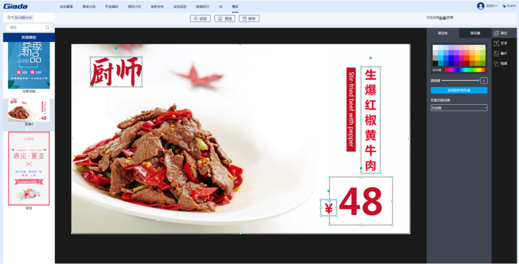 熊猫科技智慧餐厅综合解决方案是由智能零售管理系统搭载公司自研的数字标牌播放器组成的软硬件一体化方案。该系统针对餐厅、酒店等不同行业提供典型节目模板,支持手机、电脑建议操作。用户只需3步即可完成节目的制作播放:选择节目模板,更换自己的素材(视频、图片和文字),预览保存及播放。价格、优惠折扣等信息可随时更改。