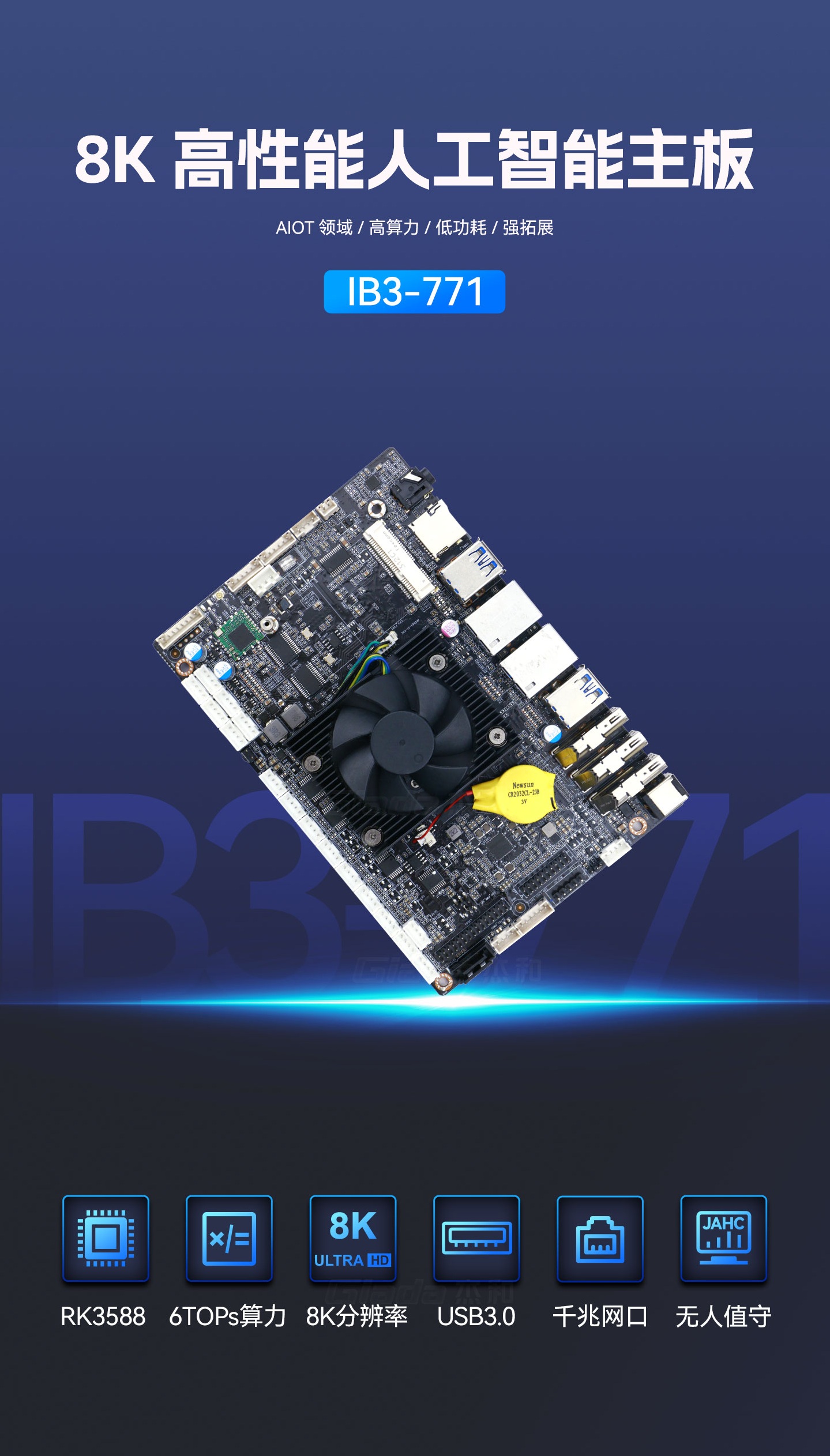 熊猫科技IB3-771采用瑞芯微全新旗舰级芯片RK3588,搭载八核64位处理器,集成ARM Mali-G610 MP4 GPU,高算力、低功耗、具备强大的视觉处理能力;性能强悍的RK3588内置AI加速NPU,提供6TOPs算力,支持主流深度学习框架,为各类AIoT应用场景提供更优的性能表现。