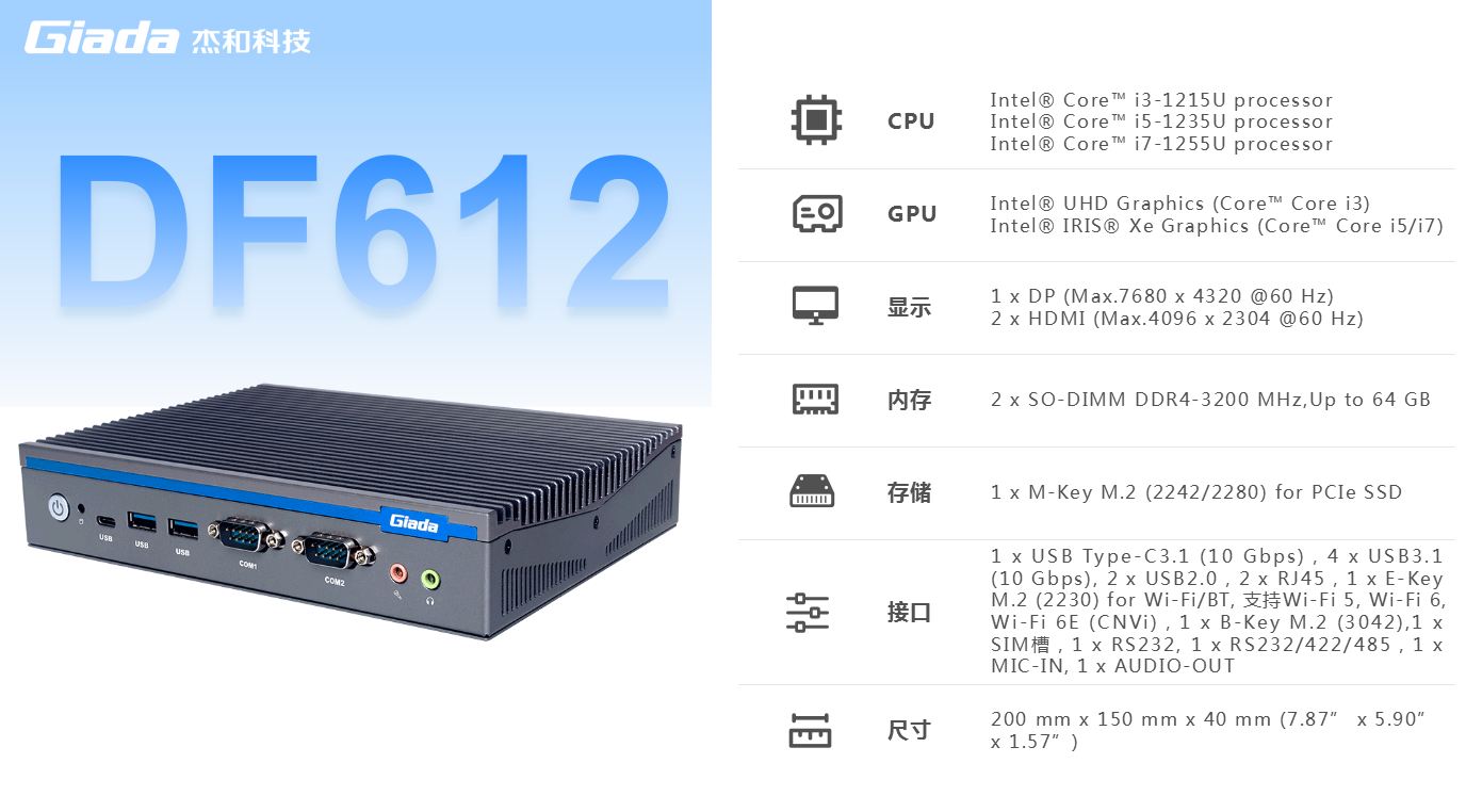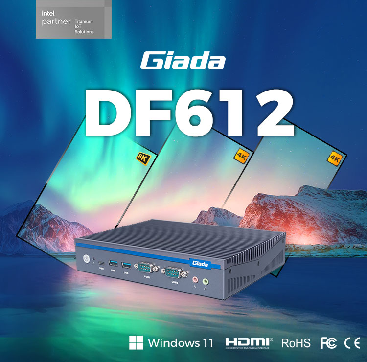 熊猫科技,商用显示硬件解决方案领导者,深耕商业显示领域24年,业务遍布欧洲,美洲,东南亚和南非等60多个国家,服务超过3000名客户,自有品牌 Giada 已成为欧洲数字标牌媒体播控器的领导品牌。在DF系列产品中,DF612作为一款全新的嵌入式计算机,搭载英特尔第12代Alder Lake处理器,具有突破性的技术、增强的图形处理能力和丰富的I/O接口,广泛应用于商业显示、智能车载、安防领域和边缘人工智能等场景。