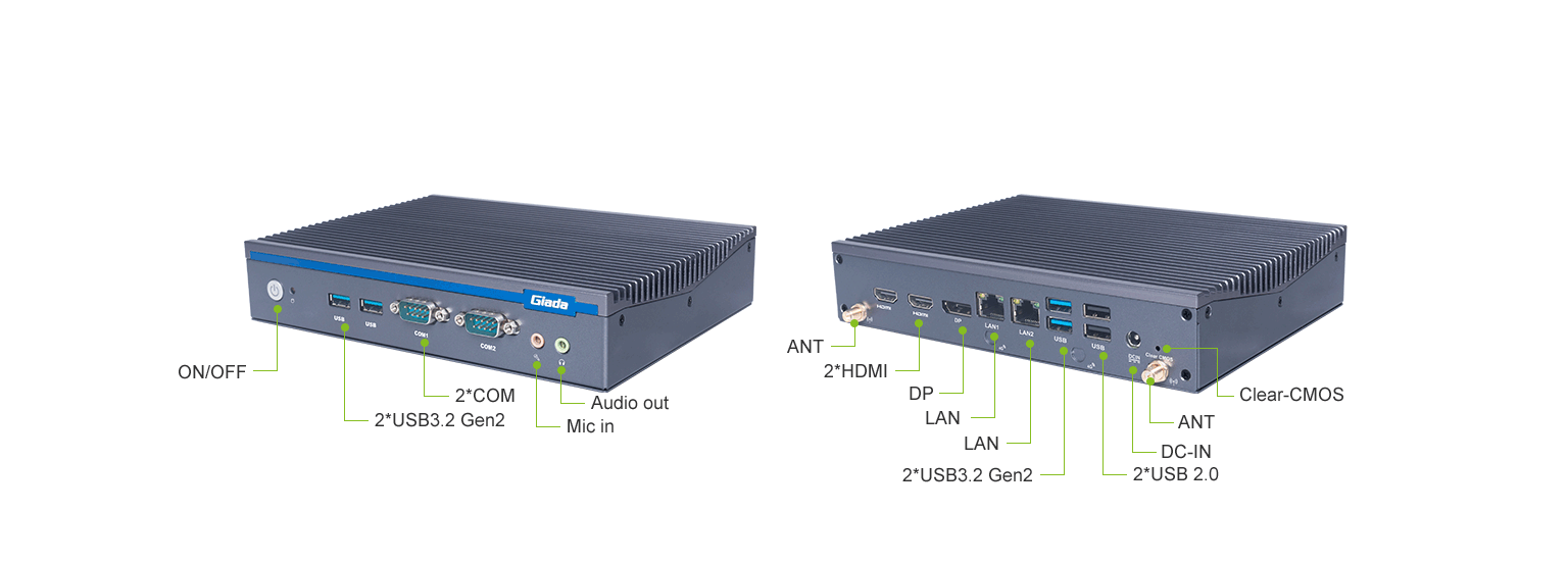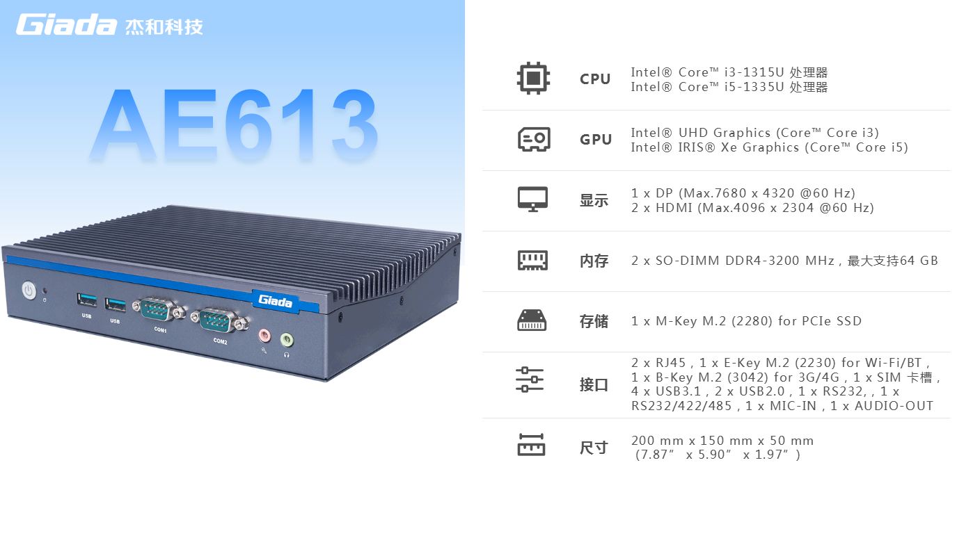 熊猫科技AE613支持Windows 11 (64bit) /Linux Ubuntu (64bit)系统,双千兆自适应RJ45网口,4 x USB3.1 (10 Gbps),2 x USB2.0,1 x RS232,,1 x RS232/422/485,1 x MIC-IN,1 x AUDIO-OUT,丰富的I/O功能接口,实现更多功能扩展。