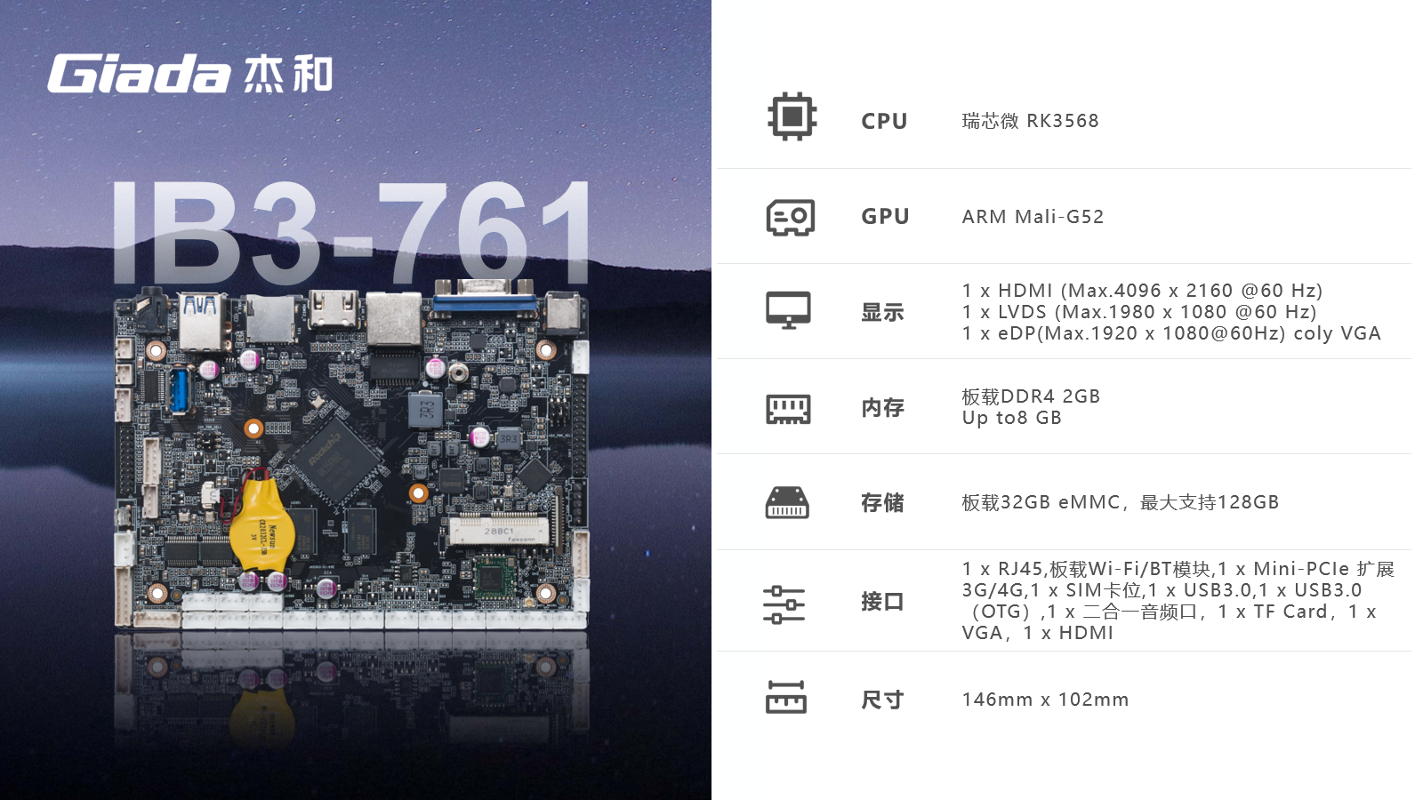 板载双通道DDR4内存,eMMC5.1存储和双频Wi-Fi,蓝牙4.2