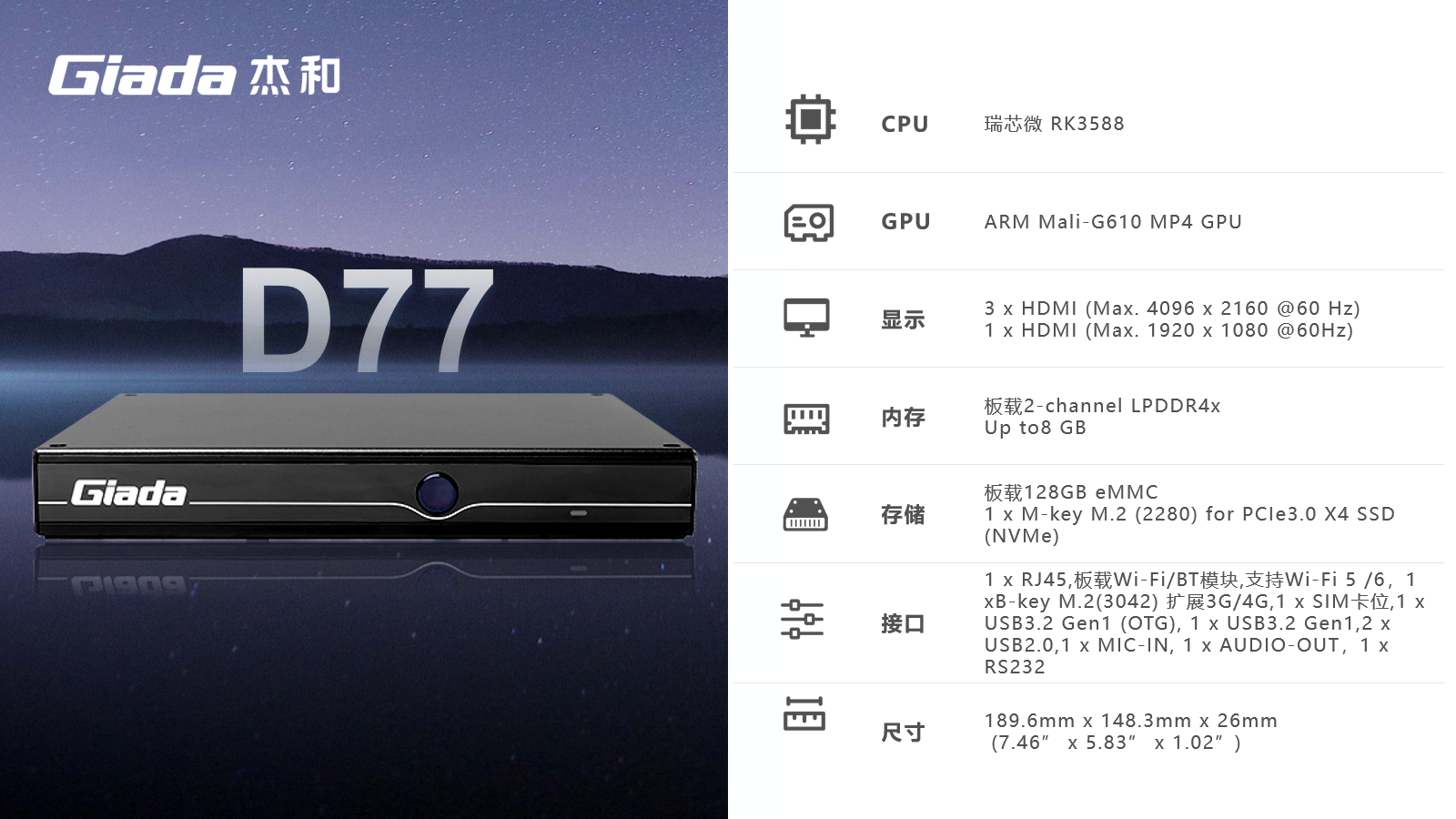 AIoT的落地场景包括智慧工业、智慧零售、智慧社区、智慧城市、智能显示、医疗健康等领域,在实际落地时,对物联网硬件设备的AI算力、数据运算、存储能力,稳定性及可扩展性能等提出更高要求,Giada熊猫科技作为行业领先的物联网数智化技术服务商,深入布局AIoT领域,推出AI产品系列,包括3.5寸主板、嵌入式整机、边缘计算盒子等,全方位覆盖了入门级到高性能级,满足不同应用场景的需求,为用户赋能。