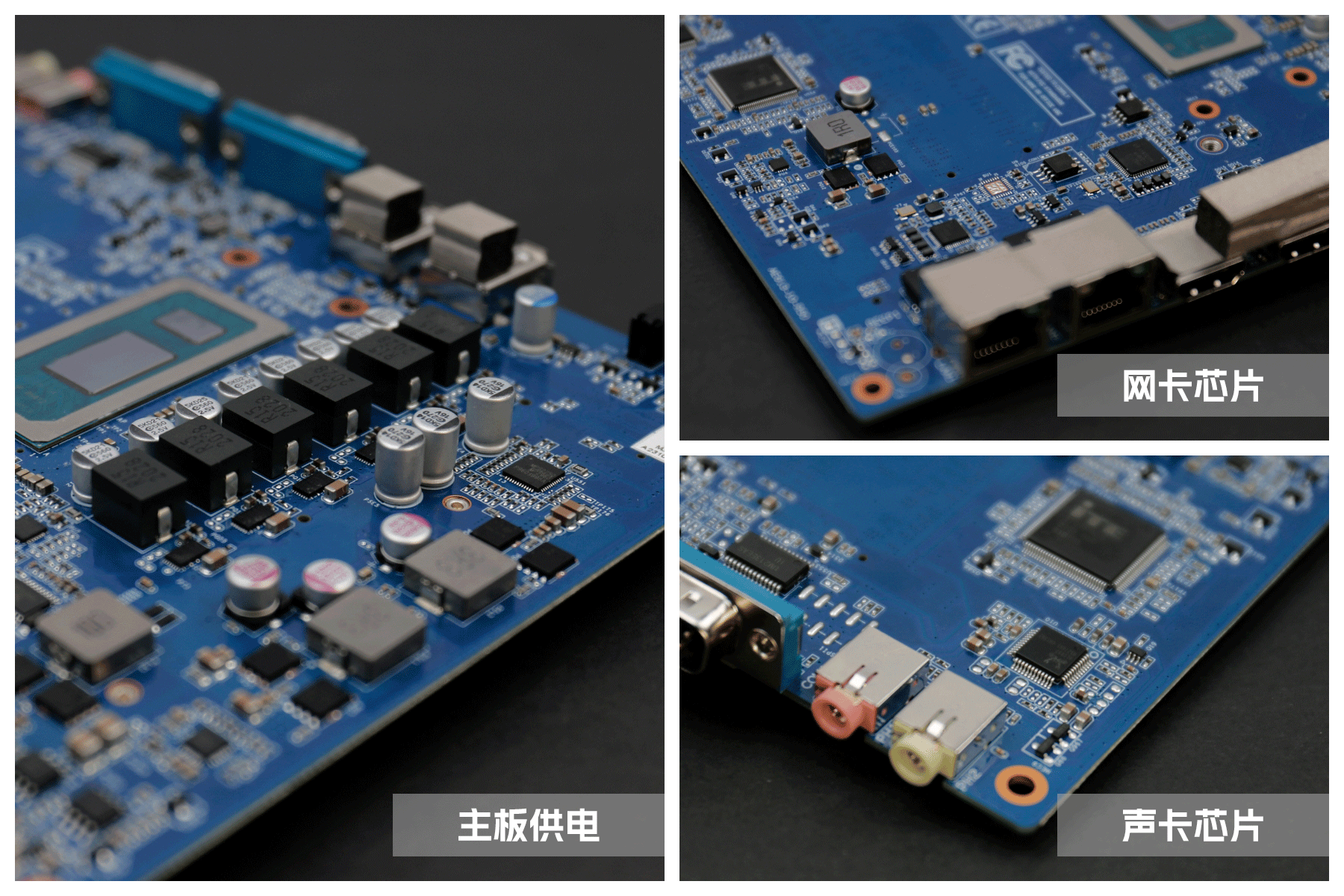 熊猫AE613主板的供电相关部分都覆盖了银色导热胶,熊猫把导热胶撕下来,可以看到主板采用的是4+2相供电,在主板两侧的接口附近,都分布了相关的芯片,音频接口附近可以看到一个经典的“小螃蟹”ALC897 声卡芯片,在双网口RJ45附近有两个网卡芯片,分别是Intel I210IT和Intel I219LM(支持 Vpro),整体做工比较扎实,元器件排列也很规整。