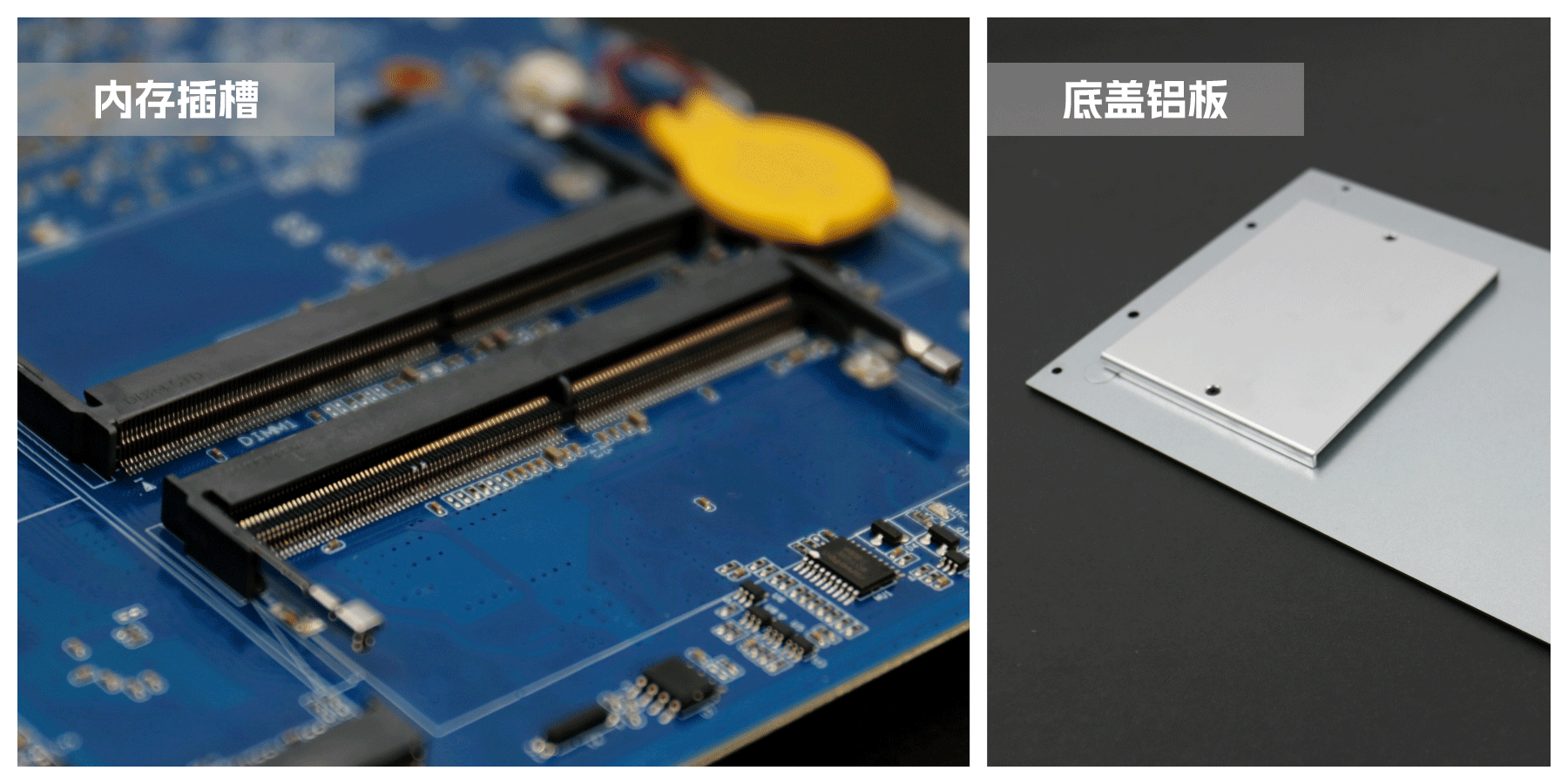 熊猫AE613主板的背面面积占比较大的是内存插槽,采用双通道两条内存槽设计,最大支持容量可达64GB,最高支持DDR4-3200MHz频率,内存与底壳接触面装备了一块散热铝板用于高效散热。