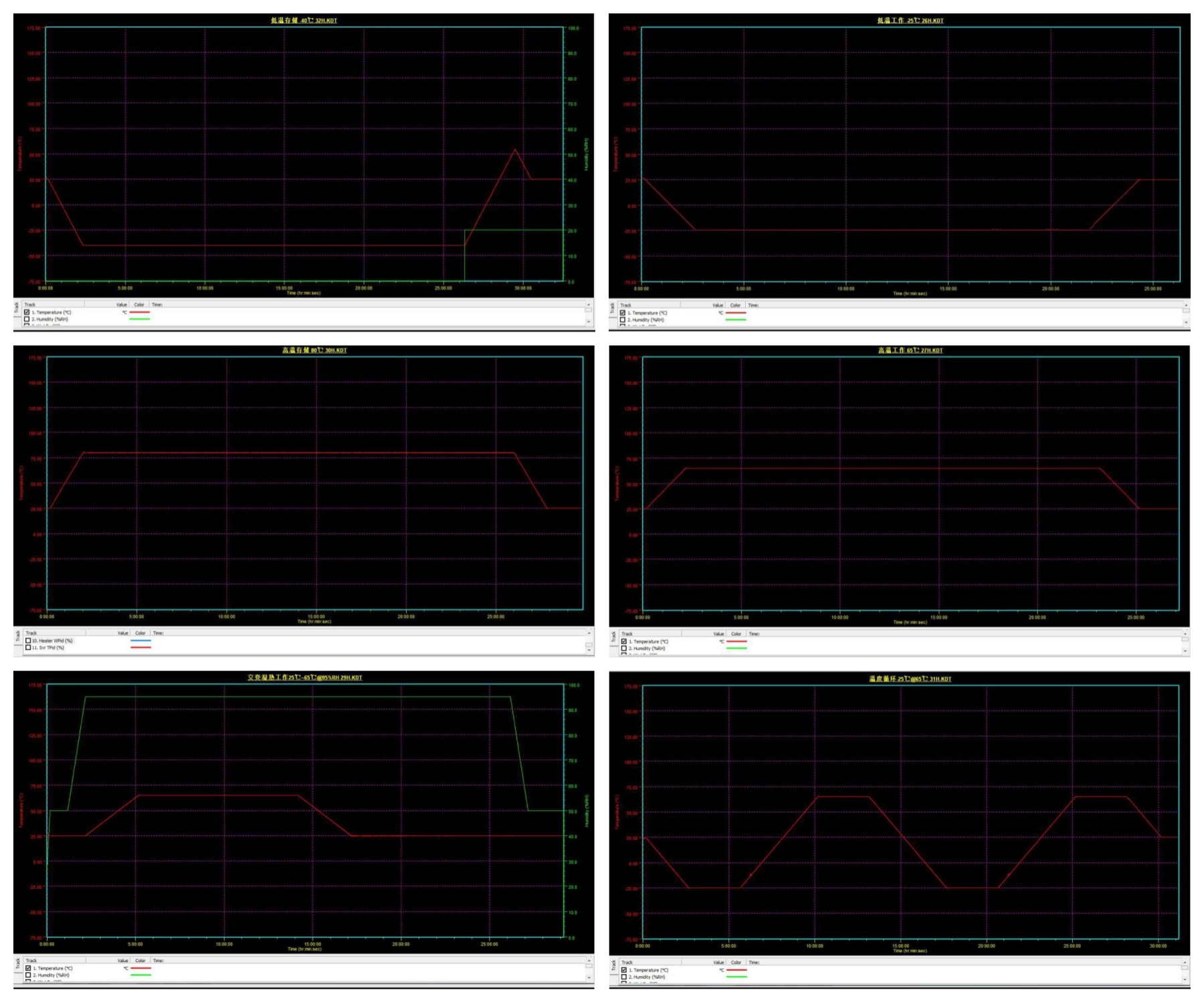 气候环境中对熊猫AE613会造成影响的主要是温度和湿度,接下里熊猫需要在恒温恒湿箱中,通过设定温度控制箱中的温度,对AE613进行七项测试,测试顺序为:低温贮存→低温工作→高温贮存→高温工作→交变湿热→高温循环→恒定湿热存储。