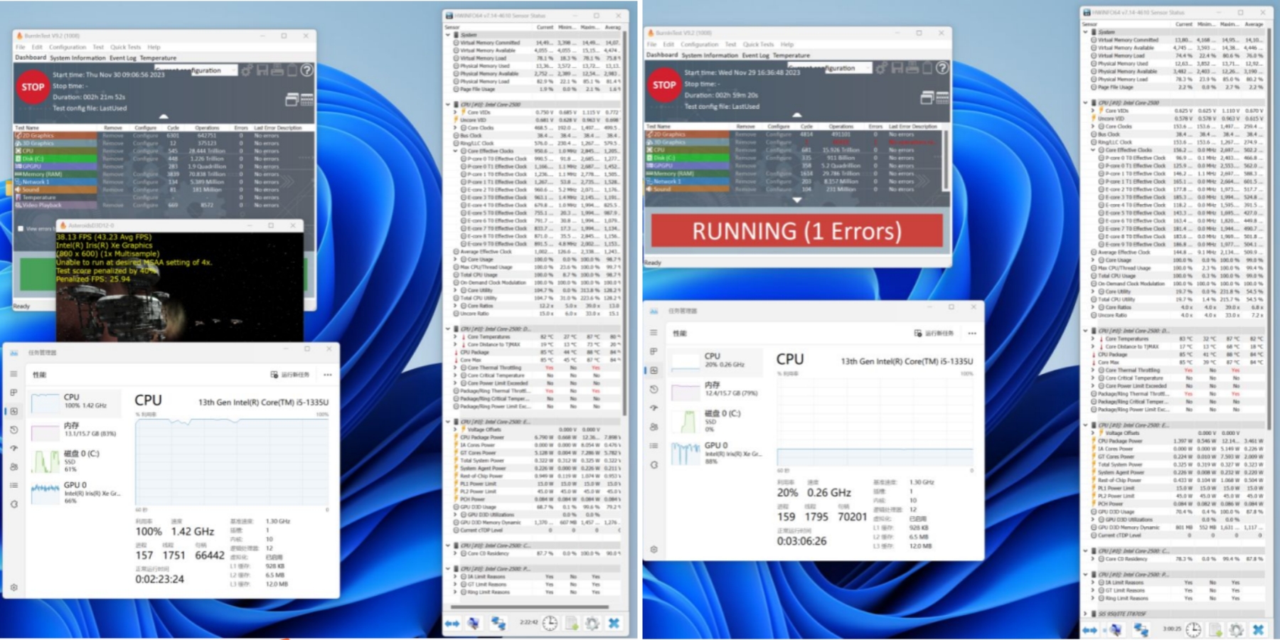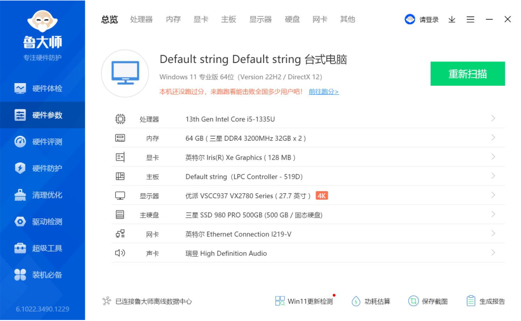 面是鲁大师识别的熊猫AE613硬件参数详情,熊猫进行跑分测试的核心三大件选择的是13th Gen Intel(R) Core(TM) i5-1335U @1.30GHz处理器,Intel(R) Iris(R) Xe Graphics显卡,三星 32GB*2 DDR4 3200MHz内存,三星SSD 980 PRO 500GB(500 GB/固志硬盘),下面熊猫来看详细的跑分数据。