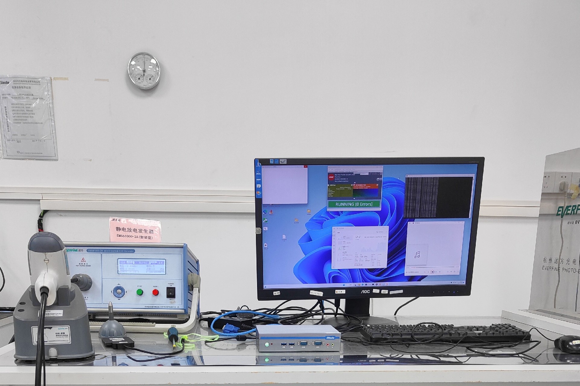 熊猫AE613的静电测试,是通过专业设备静电放电发生器进行测试,测试接口收到外部的静电后,是否会影响到机器的正产运行。在实际操作中,对每个接口测试点采取正负极各 25 次连续单次放电(时间间隔 1.5 秒),对于涂漆是绝缘层、非导电(例如,塑料)连接器内可接触的点只进行空气放电。试验结束后,AE613能正常工作,无可察觉的通信质量的降低,无控制功能的丧失或存储数据的丢失,并且保持通信连接,测试通过。
