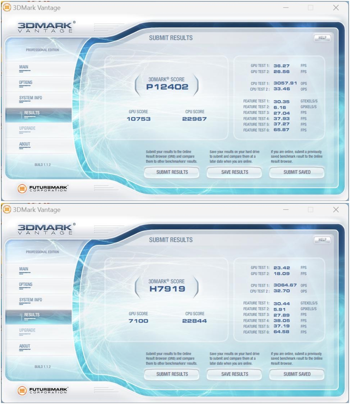 3DMark Vantage一款3D图形性能评测软件,主要用于评测电脑的显卡和处理器的性能。熊猫按照画质等级,记录了性能级(Performance,P)和高端级(High,H)两份数据。其中,Performance的综合得分为P12402,High的综合得分为H7919,表现不错,这个成绩已经完全能够满足主流用户的需求了。