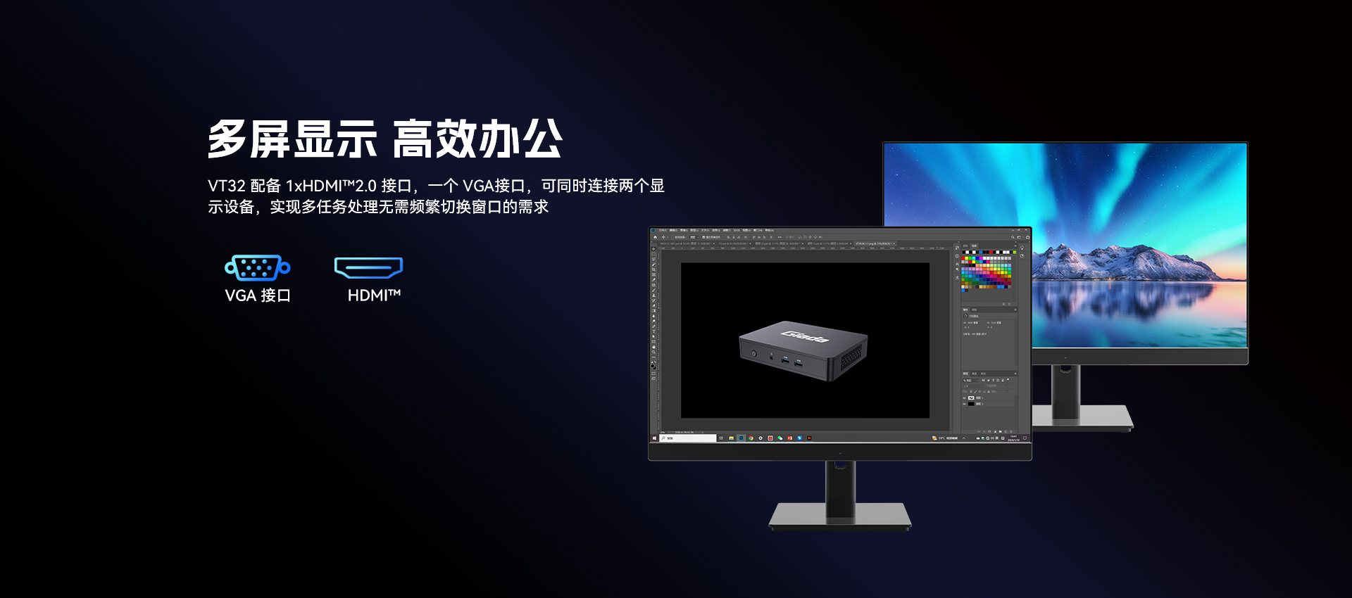 提供1xVGA,1 x HDMI™接口,支持双路视频输出
